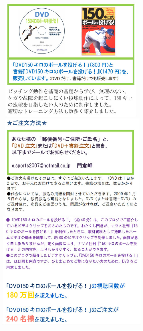 「DVD150キロのボールを投げる! 取材ビデオ編集版」(約40分)を、800円(送料無料)でお分けしております。 【お申し込み先】イー・スポーツ2007 門倉 岬 <メールアドレス> e.sports2007@hotmail.co.jp 「DVD希望」とお書きになり、あなたの「ご住所」「郵便番号」「お名前」をお知らせください。2、3日中にお送りします。料金800円は、郵便振替での後払いです。
